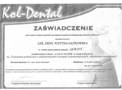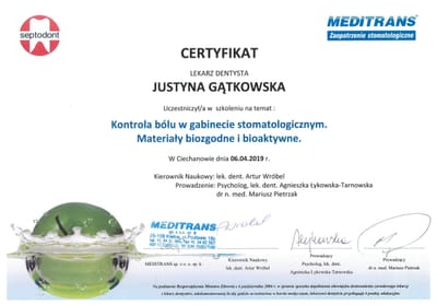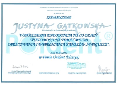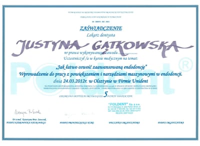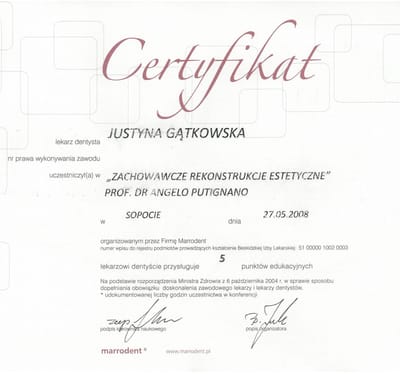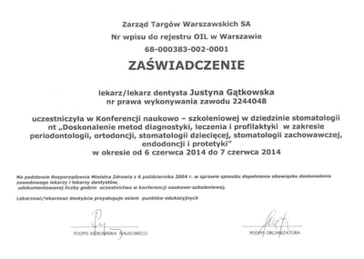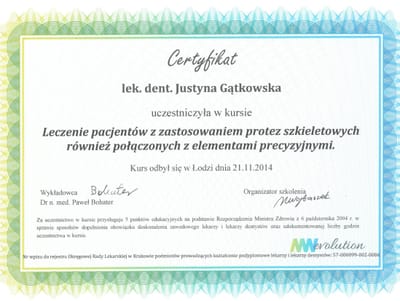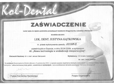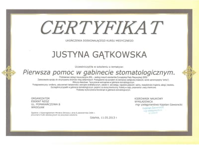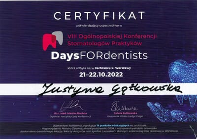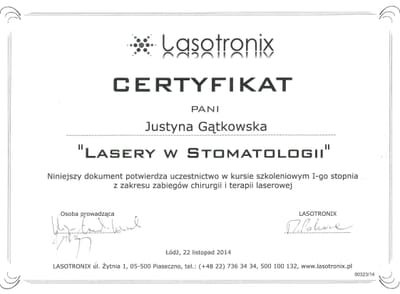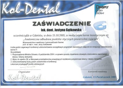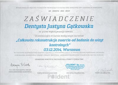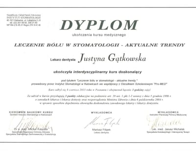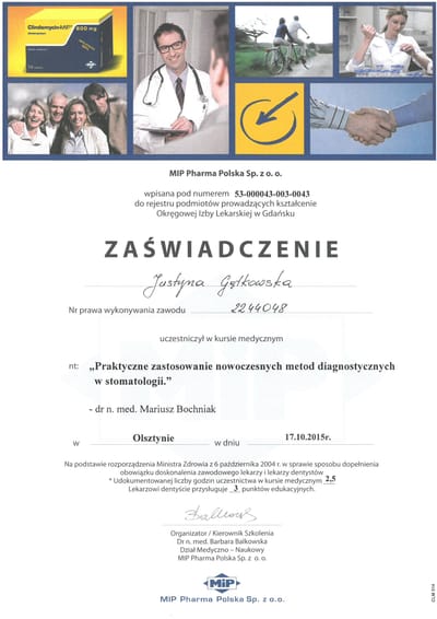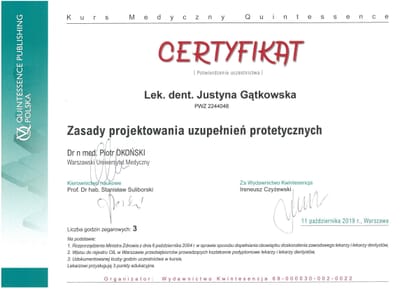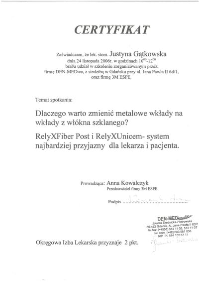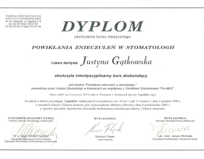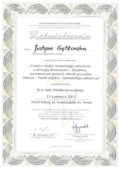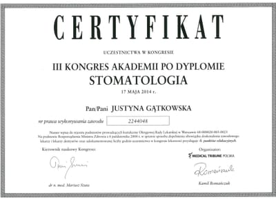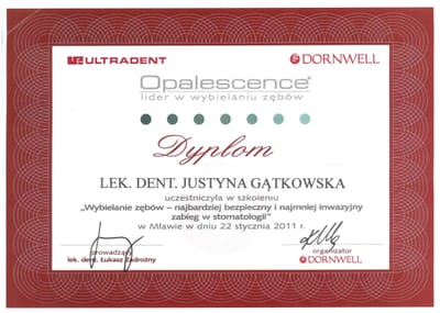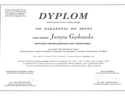 Lek. dent. Justyna Gątkowska jest absolwentką Akademii Medycznej w Gdańsku. Ukończyła kierunek lekarsko-dentystyczny w 2005 roku.
