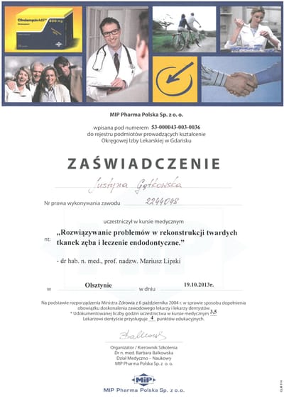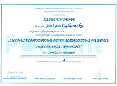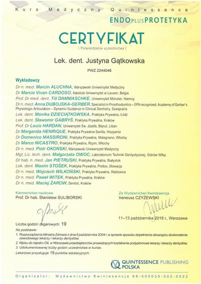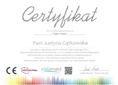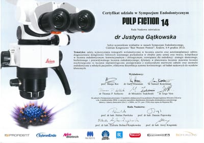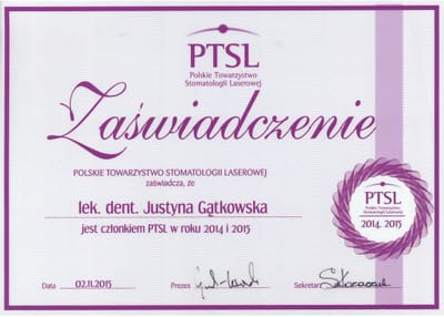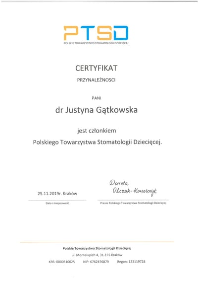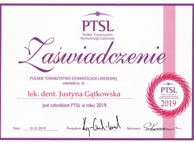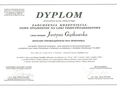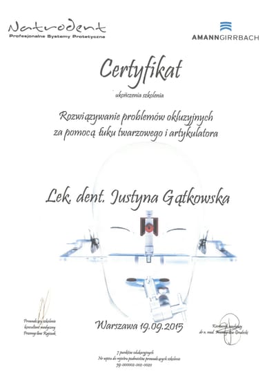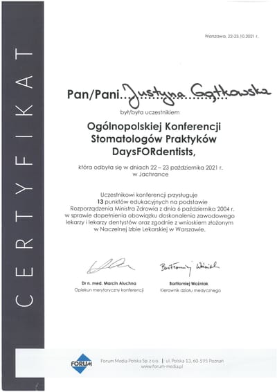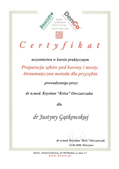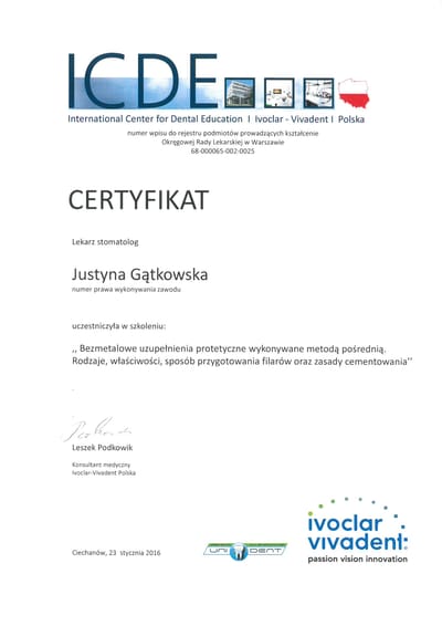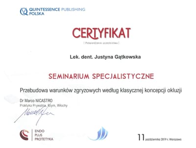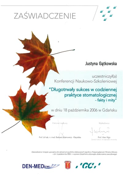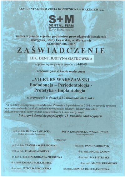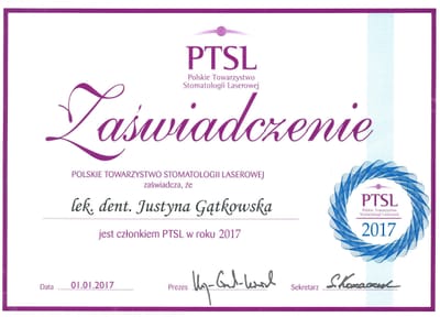 Lek. dent. Justyna Gątkowska jest absolwentką Akademii Medycznej w Gdańsku. Ukończyła kierunek lekarsko-dentystyczny w 2005 roku.